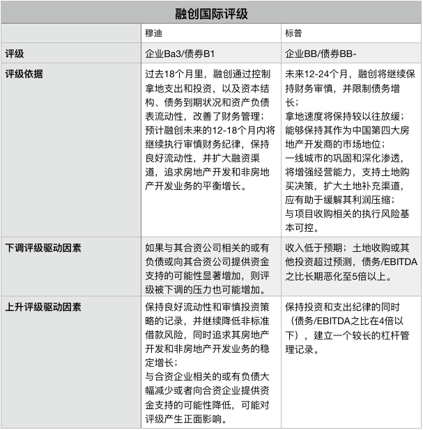 上述是標普和穆迪提升融創評級的依據之一,剛剛過去的一周,這兩家評級機構接連均將融創的主體、債券評級上調一級。