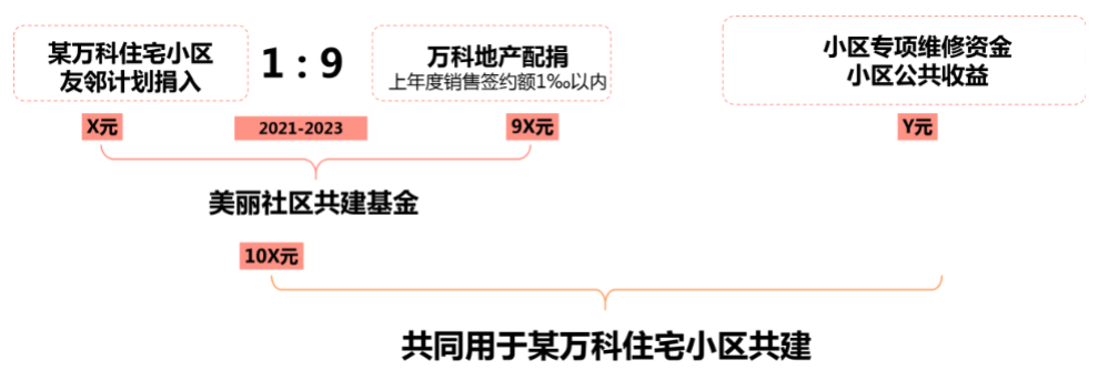 萬科地產美麗社區計劃預備資金首期將按照9:1的比例與萬科物業“友鄰計劃”募集的資金進行配捐,萬科地產配捐資金從上一年度銷售簽約的千分之一中分配。在具體項目使用上,將與各萬科小區的專項維修資金、公共收益配合使用,進一步緩解入住滿五年的萬科小區在更新改造方面資金不足的問題。
