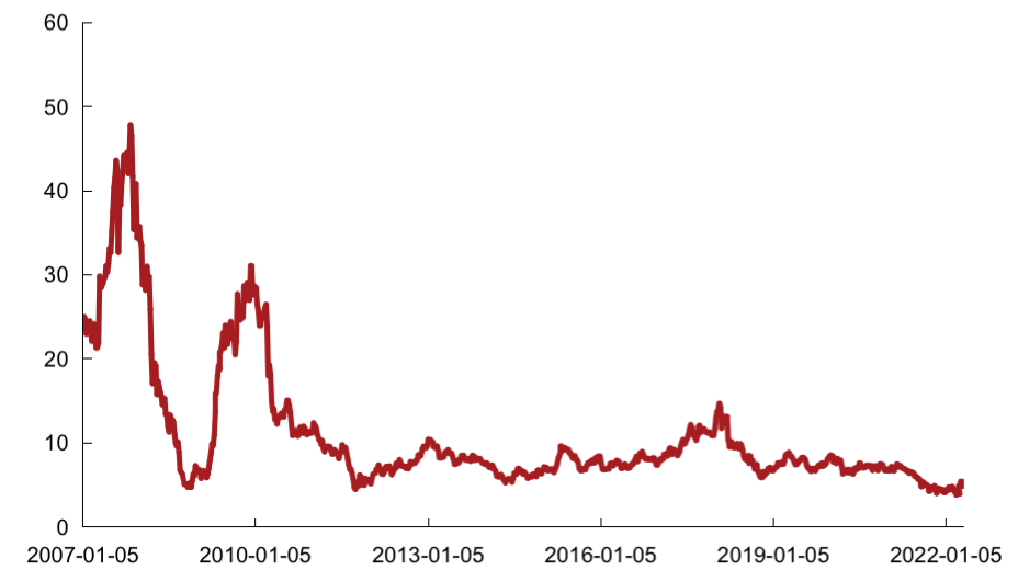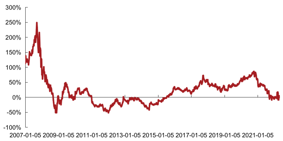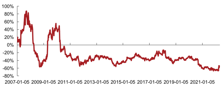 4月相對恒指PB周均值為2.4% ,低于上月的周均值7.2%,低于2021年全年相對恒指PB周均值22.5%。