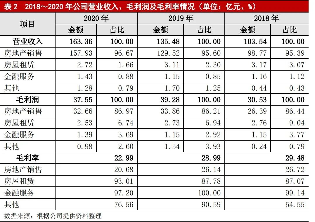 下圖可以看到,房地產銷售業務還是華宇集團的主力軍,2018-2020年,營業規模上整體營收呈增長趨勢,分別為103.54億元、135.48億元、163.36億元。但毛利潤和毛利率就沒那么樂觀,2020年的影響還是挺明顯。