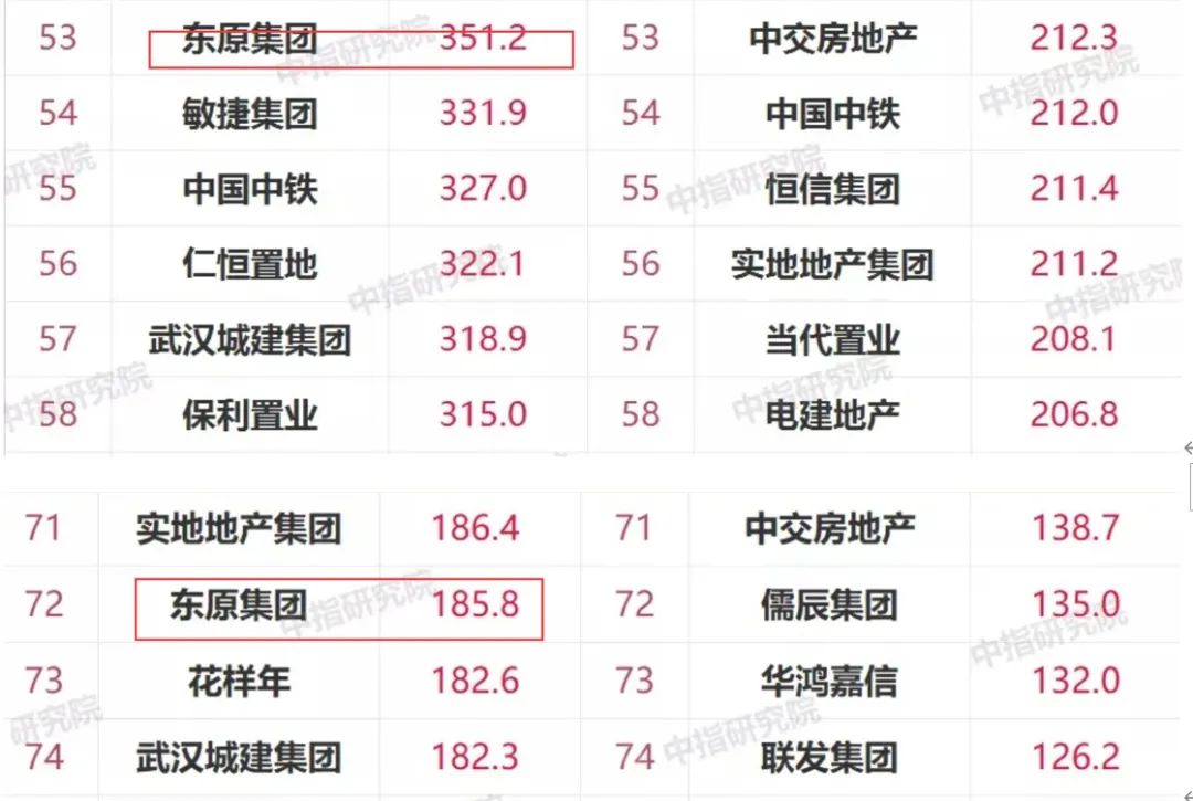 從中指院統計的銷售榜單里杠桿地產看到,和2019上半年比,東原掉出前50,滑落至53位,權益銷售額排名第72位。