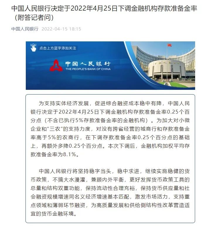 決定于2022年4月25日下調金融機構存款準備金率0.25個百分點(不含已執行5%存款準備金率的金融機構)。