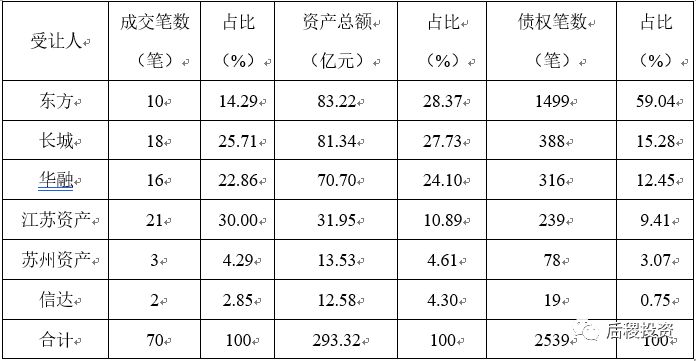 在該轉(zhuǎn)讓類型中,資產(chǎn)總額最大的交易的轉(zhuǎn)讓人為信達江蘇分公司,受讓人為東方江蘇分公司,資產(chǎn)總額28.76億元,涉及56筆債權(quán)。第二大的交易轉(zhuǎn)讓方仍為信達江蘇分公司,受讓人為長城江蘇分公司,資產(chǎn)總額13.21億元,涉及18筆債權(quán)。其余交易是資產(chǎn)總額均在6億元以下。
