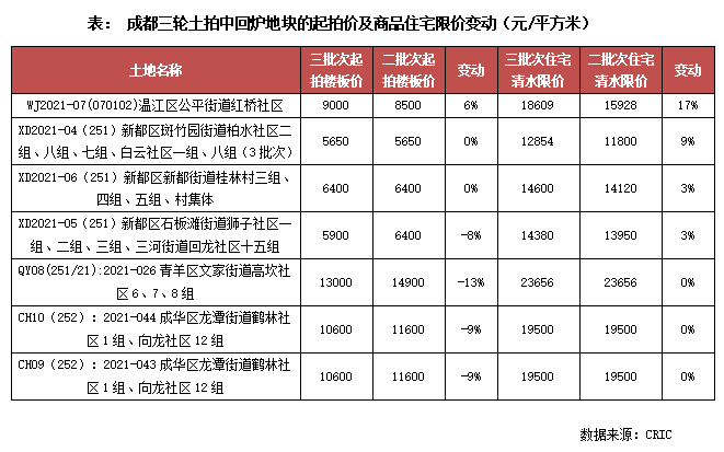 最值得一提的當屬成都第三輪集中供應地塊的商品住宅清水限價多較此前明顯提升。如高新區大源板塊宅地的商品住宅清水限價提升至28500元/平方米,是成都開啟住宅限價以來出讓地塊中商品住宅限價最高的地塊,天府新區華陽鶴林村地塊的限價也由此前的17700元/平方米提升至2萬元/平方米以上。而在7宗回爐宅地中,多數地塊的商品住宅限價也給予了抬升,漲幅由3%~17%不等。