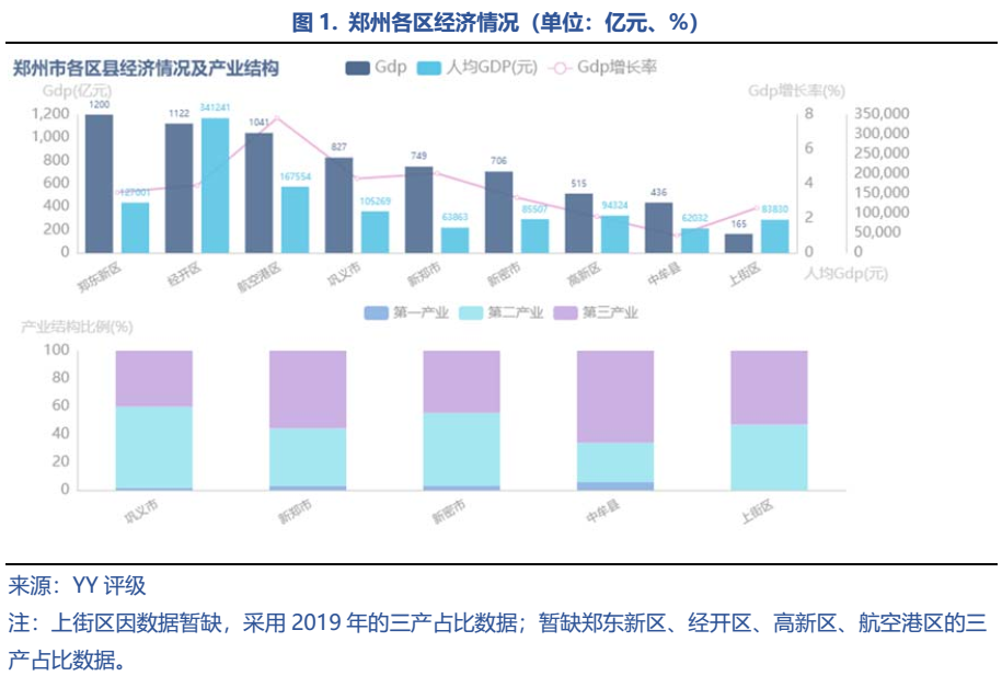 鄭州市現(xiàn)轄6區(qū)5市1縣及鄭州航空港經(jīng)濟(jì)綜合實(shí)驗(yàn)區(qū)、鄭東新區(qū)、 鄭州經(jīng)濟(jì)技術(shù)開發(fā)區(qū)、鄭州高新技術(shù)產(chǎn)業(yè)開發(fā)區(qū),四大園區(qū)定位各不相同:航空港區(qū)是我國(guó)第一個(gè)以航空經(jīng)濟(jì)為引領(lǐng)的國(guó)家級(jí)新區(qū);鄭東新區(qū)則是中原經(jīng)濟(jì)區(qū)金融集聚核心功能區(qū)、全省推進(jìn)城鎮(zhèn)化建設(shè)的先行區(qū)和國(guó)家大數(shù)據(jù)綜合試驗(yàn)區(qū)核心區(qū);經(jīng)開區(qū)側(cè)重發(fā)展了汽車及零部件、裝備制造、現(xiàn)代物流三大千億級(jí)主導(dǎo)產(chǎn)業(yè);高新區(qū)則定位于“發(fā)展高科技、實(shí)現(xiàn)產(chǎn)業(yè)化”,擁有完善的創(chuàng)新孵化培育體系。鄭州共有9個(gè)發(fā)債區(qū)縣,在發(fā)債各區(qū)中,鄭東新區(qū)GDP總量領(lǐng)跑,人均GDP位居前三,經(jīng)濟(jì)實(shí)力較強(qiáng)。以汽車和裝備制造等為主導(dǎo)產(chǎn)業(yè)的鄭州經(jīng)開區(qū)人均GDP一馬當(dāng)先,高達(dá)34.1萬(wàn)元居全市首位,GDP總量在2019年首破千億大關(guān)的基礎(chǔ)上也再創(chuàng)新高。此外,航空港區(qū)GDP也過(guò)千億大關(guān),上街區(qū)、中牟縣和高新區(qū)則以較低的GDP總量居末尾。