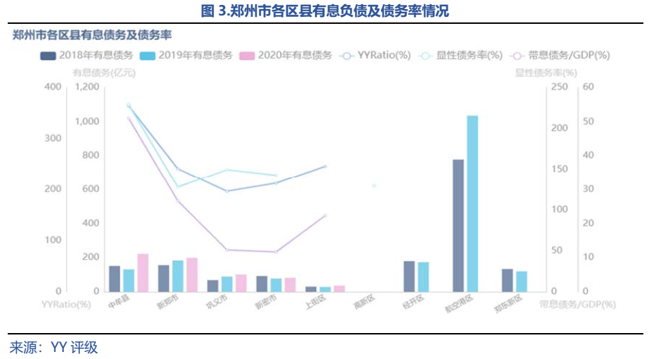 鄭州市總體債務(wù)率不高,分區(qū)域看,因發(fā)展需要,航空港區(qū)2018、2019年有息債務(wù)“一騎絕塵”,但2020年數(shù)據(jù)尚未披露完整。從目前可得的2020年的債務(wù)數(shù)據(jù)來(lái)看,中牟縣的帶息債務(wù)絕對(duì)值和債務(wù)率均最高,截至2020年末,中牟縣有息債務(wù)余額為222.32億元,YY-Ratio為364.46%,債務(wù)風(fēng)險(xiǎn)并不高;新鄭市的有息債務(wù)余額和債務(wù)率次之;值得注意的是,上街區(qū)的有息債務(wù)余額雖然不高,但因財(cái)政實(shí)力較弱,YY-Ratio較高。