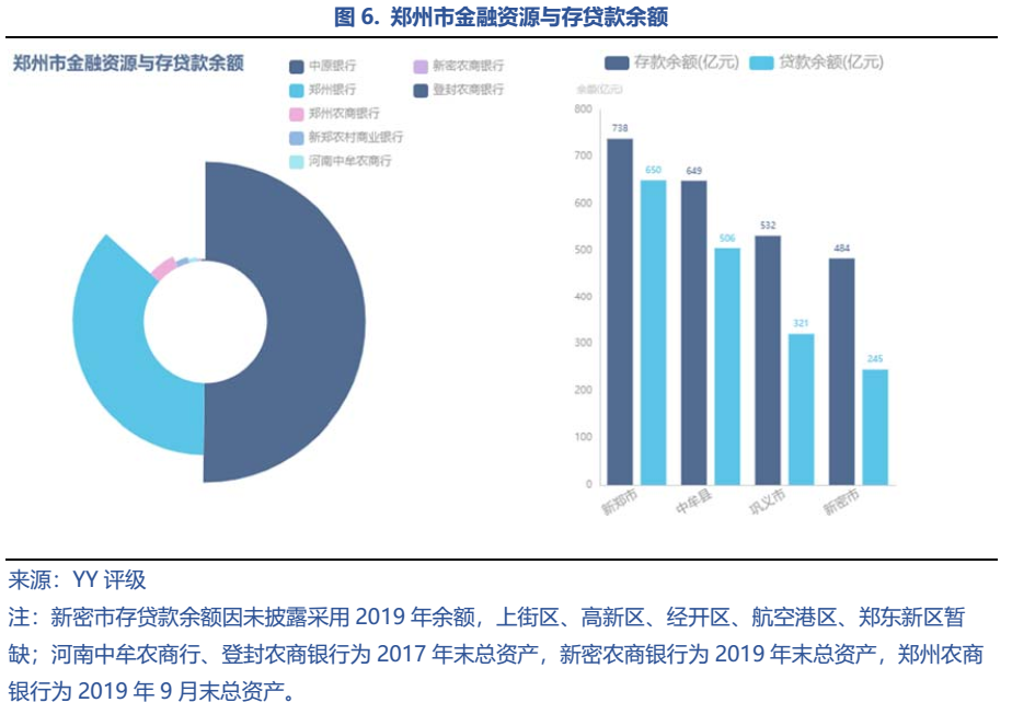 鄭州銀行數(shù)量尚可,但主要是農(nóng)商行,信息披露程度不高。鄭州市共有9家銀行,其中2家城商行(中原銀行和鄭州銀行),7家農(nóng)商行(鄭州農(nóng)商銀行、中牟農(nóng)商銀行、新密農(nóng)商銀行、鞏義農(nóng)商銀行、新鄭農(nóng)村商業(yè)銀行、滎陽(yáng)農(nóng)商銀行和登封農(nóng)商銀行)。從數(shù)量上看,鄭州市銀行并不少,但以農(nóng)商行為主,財(cái)務(wù)信息披露不多,除中原銀行、鄭州銀行、新鄭農(nóng)村商業(yè)銀行之外,其余銀行的總資產(chǎn)等數(shù)據(jù)僅可追溯至2017、甚至2011年。2020年末中原銀行和鄭州銀行的資產(chǎn)規(guī)模分別為7,574.82和5,478.13億元,在“中國(guó)銀行業(yè)100強(qiáng)榜單”中分別位居第35和42名,金融資源實(shí)力較強(qiáng)。