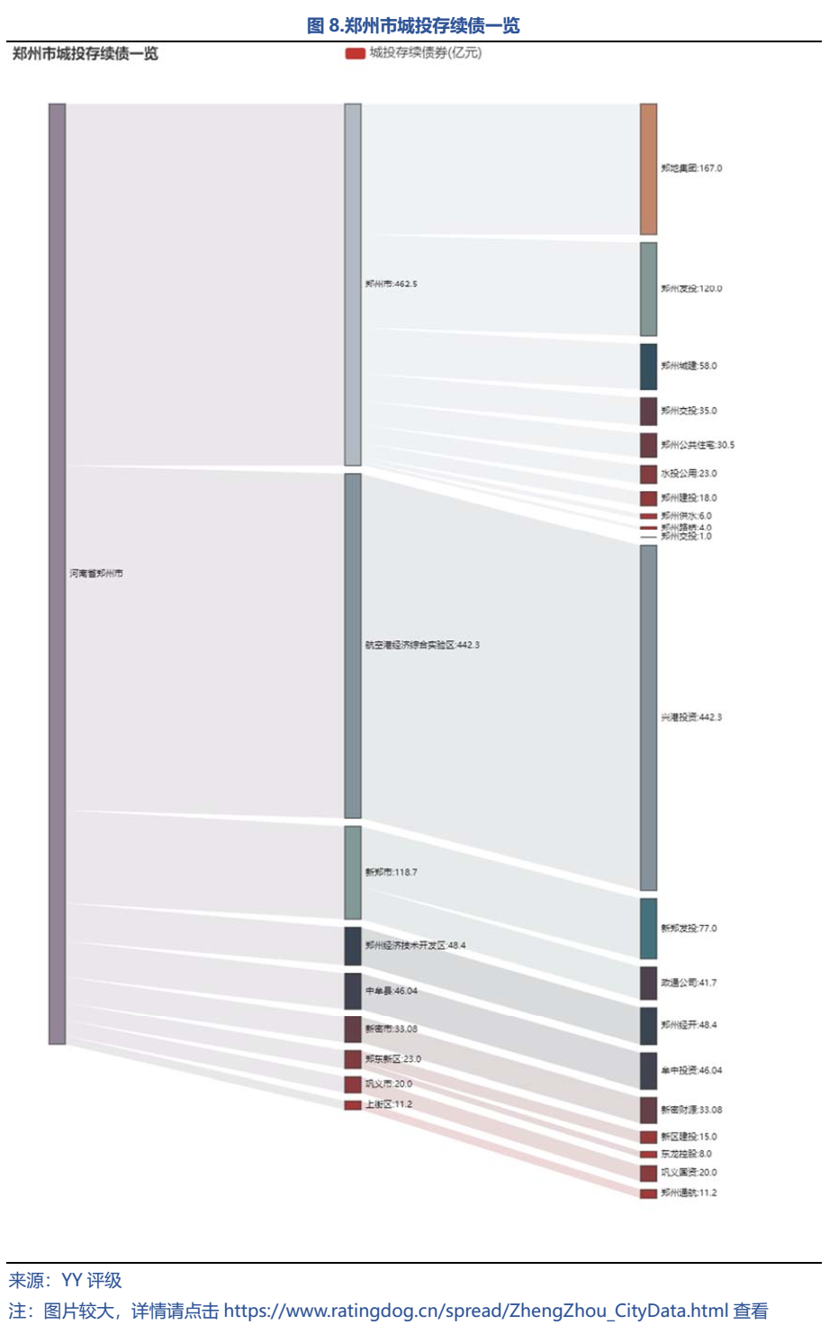 截至2021年7月8日,鄭州市的發(fā)債平臺(tái)主要分布在地市級(jí)、功能區(qū)和郊縣,平臺(tái)存續(xù)債合計(jì)規(guī)模超1,200億元。市級(jí)平臺(tái)債務(wù)主要集中在鄭地集團(tuán)和鄭州發(fā)投,分別占全部市級(jí)城投存續(xù)債的36.1%和25.9%;從各區(qū)看,航空港經(jīng)濟(jì)綜合實(shí)驗(yàn)區(qū)城投存續(xù)債規(guī)模最大,存續(xù)債券余額有442.3億元,且均屬于興港投資的債務(wù)。排第二位的為新鄭市,債務(wù)集中在新鄭發(fā)投和政通公司。