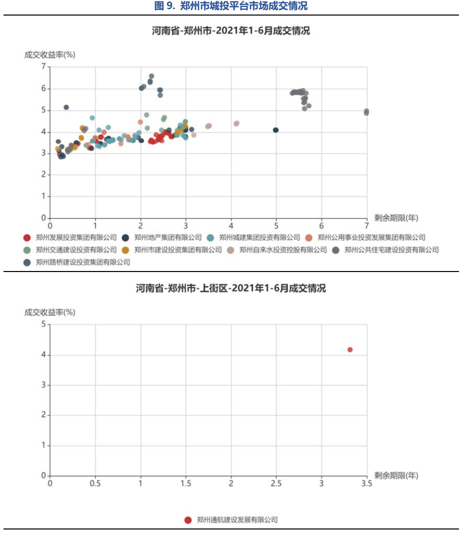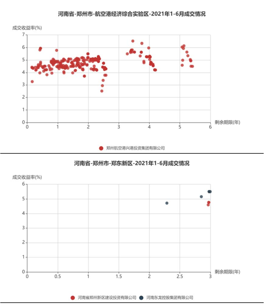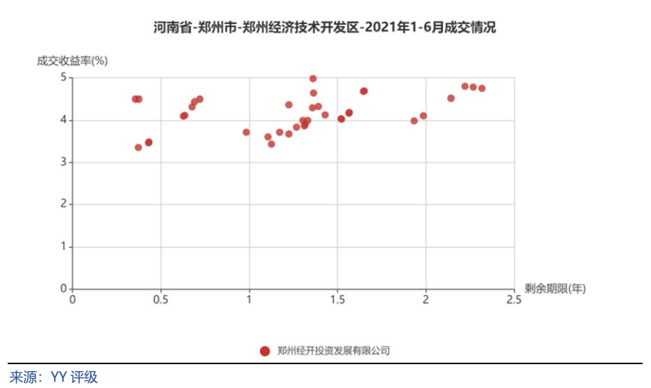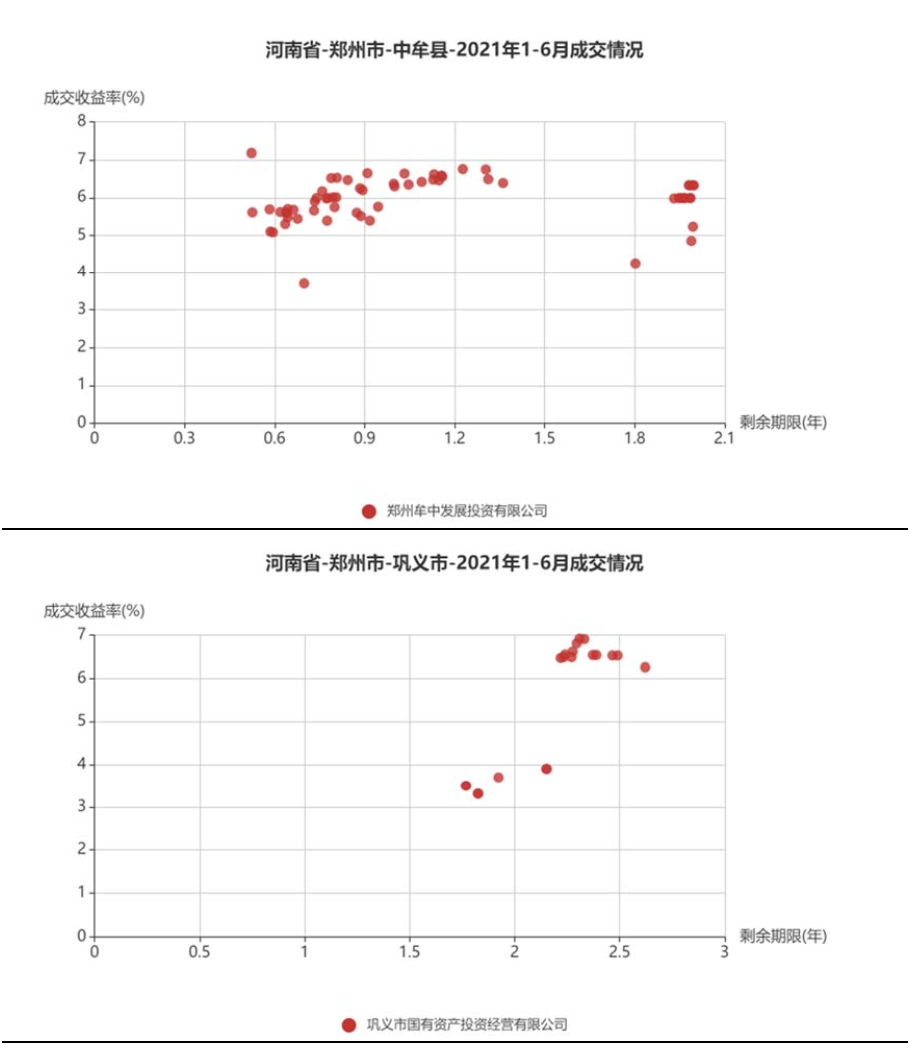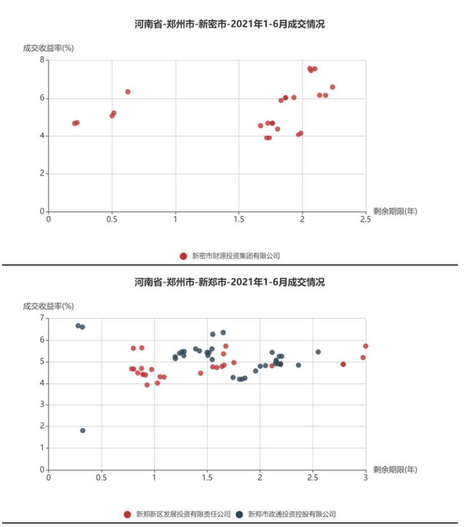 將鄭州市城投平臺(tái)按照行政層級(jí)和所屬區(qū)域,分為9類分別展示成交情況。具體來(lái)看,鄭州市級(jí)平臺(tái)成交活躍,成交收益率分散在3%~6%,基本隨著剩余期限遞增;中牟縣成交收益率相對(duì)較高,在5%~7%;鞏義市分散在3%~4%和6%~7%兩個(gè)區(qū)間;新鄭市、航空港區(qū)、鄭東新區(qū)均集中在4%~6%;經(jīng)開區(qū)集中在4%附近;新密市成交收益率相對(duì)分散;上街區(qū)僅一個(gè)成交主體。