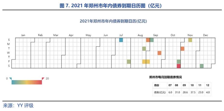 鄭州市債券到期分布較為平均,償債壓力不大。債券償還壓力主要集中在8月、9月和10月。8月和9月各有3筆債券,到期金額分別為31.0和28.6億元。10月為全年金額之最,2筆債券共37.5億元到期。此外,11月有23.0億元到期。