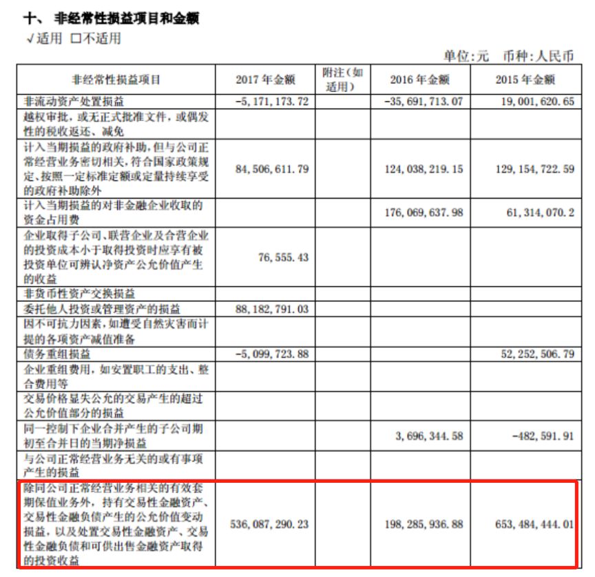 2015-2017年,公司非經(jīng)常性損益合計(jì)約25.63億元,占到同期歸母凈利潤的35.67%(追溯調(diào)整后)。