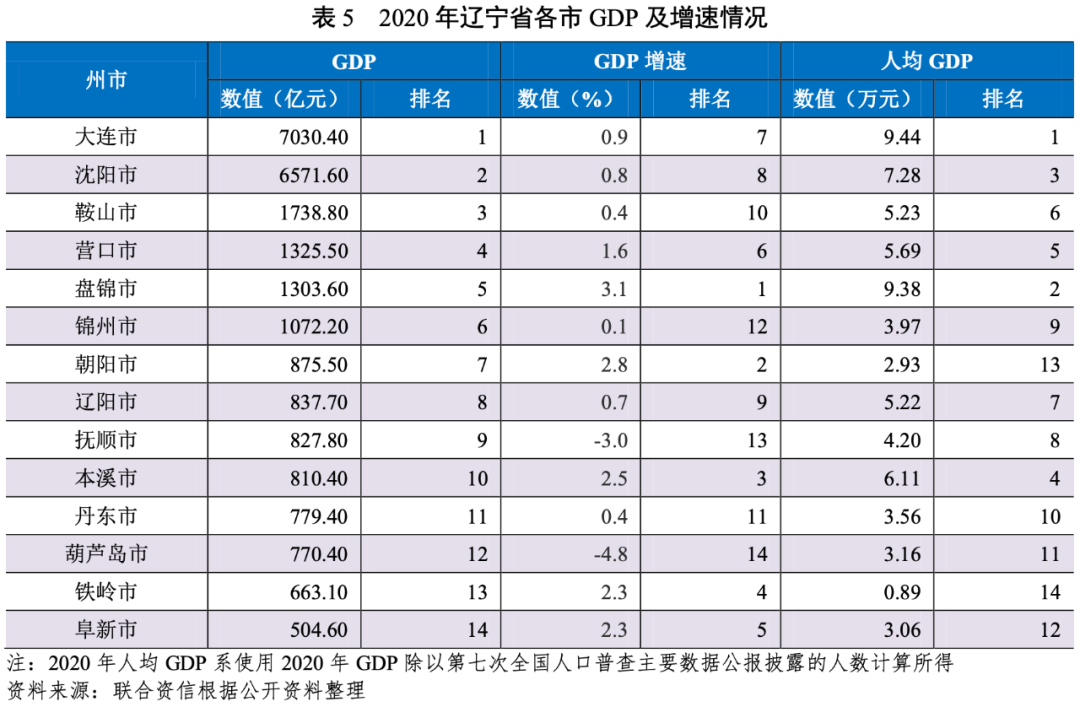 從GDP規模看,遼寧省各地級市經濟發展水平分化程度較高。2020年,大連市GDP為7030.40億元,占遼寧省經濟總量28.00%;沈陽市GDP為6571.60億元,占遼寧省經濟總量26.17%,大幅領先于全省其他城市;鞍山市、營口市、盤錦市和錦州市分別實現地區生產總值1738.80億元、1325.50億元、1303.60億元和1072.20億元,分別位列全省第三至第六;其余地區生產總值均低于1000億元。