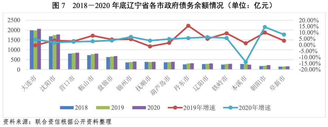 與經濟實力相匹配,遼寧省各市一般公共預算收入亦分化明顯,其中沈陽市和大連市一般公共預算收入較高且穩定性較強。2018-2020年,遼寧省內各市一般公共預算收入質量整體變化不大;各市財政自給能力均一般。從各市債務率看,營口市、盤錦市和鞍山市政府債務負擔遠高于其他市,其余市中撫順市、大連市、葫蘆島市、遼陽市和錦州市政府債務負擔重。