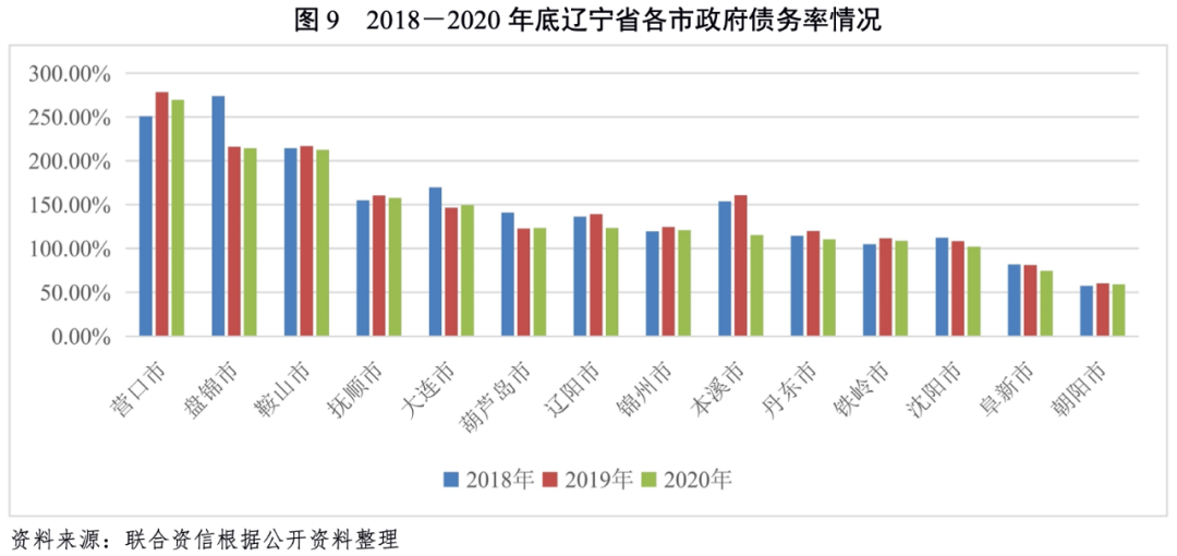 償債能力方面,截至2020年底,除大連市和葫蘆島市政府債務率有所上升,其他市均有所下降,其中本溪市下降較多。從絕對值看,2020年底,除朝陽市外,遼寧省其余各市政府債務率均高于60%。其中,營口市、盤錦市和鞍山市政府債務率位居省內前三位,均高于200%;撫順市、大連市、葫蘆島市、遼陽市和錦州市政府債務率在120%~200%之間,本溪市、丹東市、鐵嶺市和沈陽市政府債務率在80%~120%之間,其余各州市政府債務率均在80%以下。