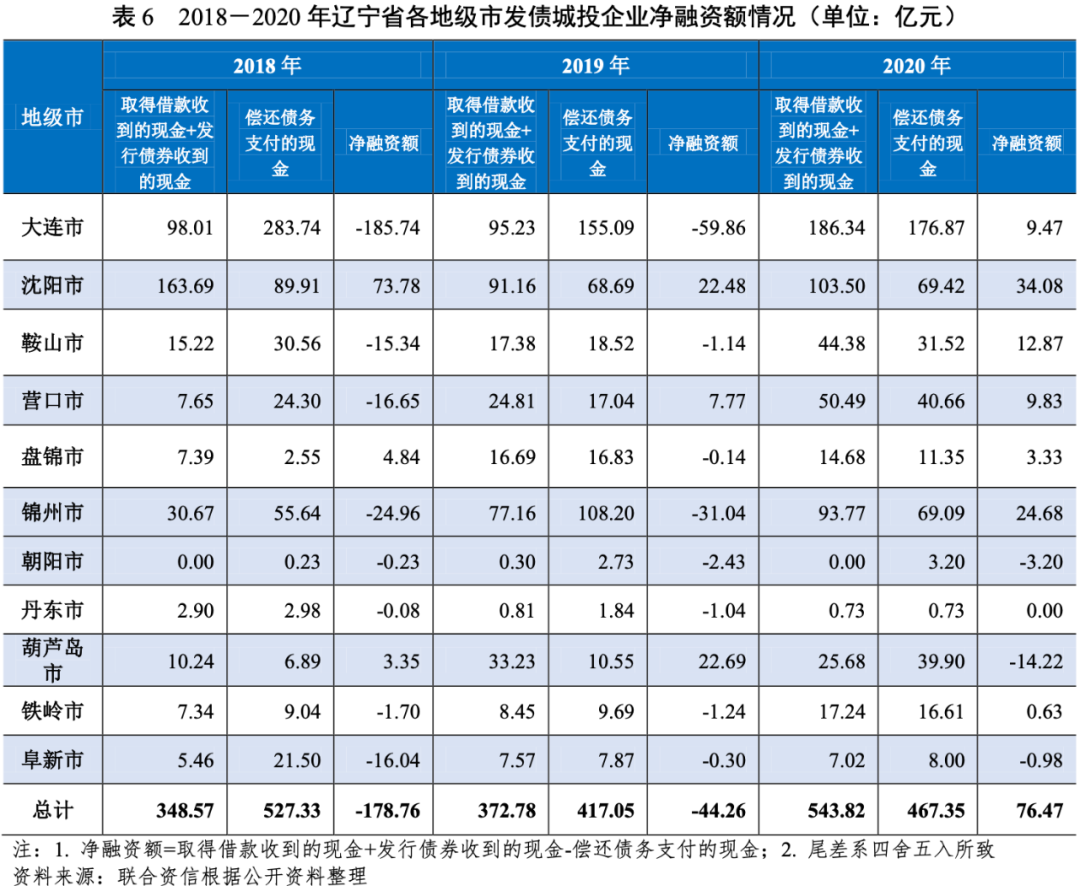 遼寧省發債城投企業債務余額主要集中于大連市和沈陽市。2020年,除葫蘆島市、朝陽市和阜新市外,遼寧省發債城投企業凈融資額均呈凈流入,融資環境有所改善。遼寧省發債城投企業債務負擔有所分化,沈陽市和朝陽市城投企業債務負擔相對較重。大連市、鐵嶺市和沈陽市的城投企業未來三年到期債券規模大,其他地市未來三年到期債券規模較小。