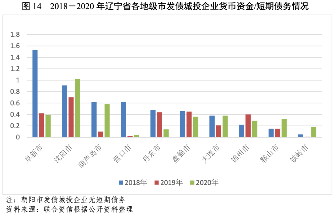 從遼寧省各地級市發債城投企業貨幣資金對短期債務的覆蓋情況來看,2018-2020年,除沈陽市、大連市、鞍山市和鐵嶺市外,各地級市發債城投企業貨幣資金對短期債務的覆蓋程度均呈不同程度的下降,反映出內遼寧省各地級市發債城投企業整體流動性逐步趨緊。具體看,2020年底,除沈陽市和葫蘆島市外,其他地市發債城投企業的貨幣資金/短期債務倍數均在0.50倍以下,短期償債能力相對較弱。