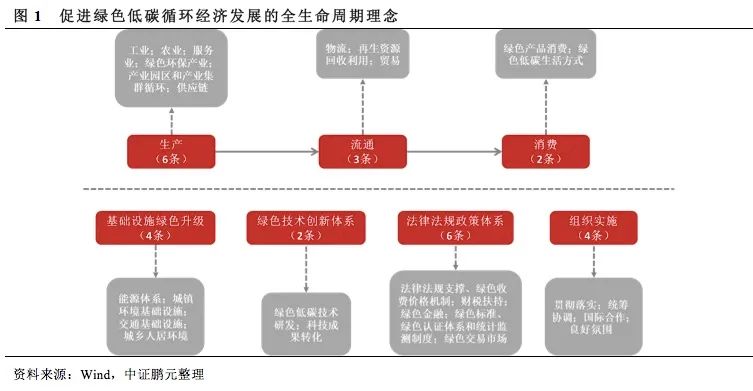 《指導意見》共30條,用全生命周期理念理清了綠色低碳循環(huán)發(fā)展經(jīng)濟體系建設過程。前3條為指導思想、工作原則和主要目標,其余27條涉及生產(chǎn)到流通再到消費環(huán)節(jié),還涉及基礎設施綠色升級、綠色技術(shù)創(chuàng)新、法律法規(guī)政策、組織實施等各個支持環(huán)節(jié)。