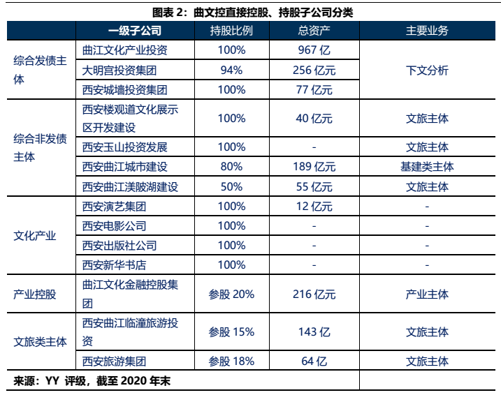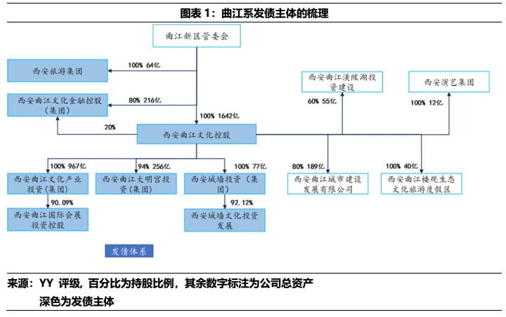 首先我們分析了目前曲江國資體系內重要發債平臺及其核心子公司的分布,其次將拆解的第一個對象錨定為盤子最大的曲文控體系,并且將其從本部、子公司曲文投、大明宮投資以及西安城墻投資四個方向進行深入分析。