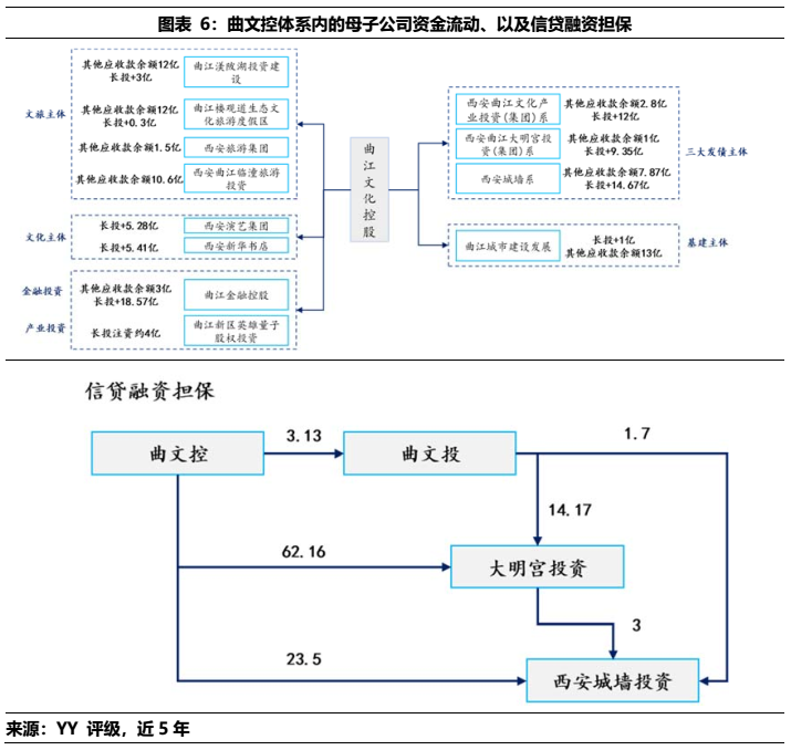 1)本部5年內的資金沉淀,主要以應收款和長投注資的形式沉淀于三大發債主體(曲文投、大明宮投資和西安城墻合計應收11億,長投增加35億),文旅類主體(樓觀道建設、臨潼旅游和渼陂湖建合計應收34億),文化主體(西安演藝和新華書店合計收購7.8億),基建(曲江城市建設應收13億)以及產業控(曲江金控注資6.57億,英雄量子股權投資注資4億)等。