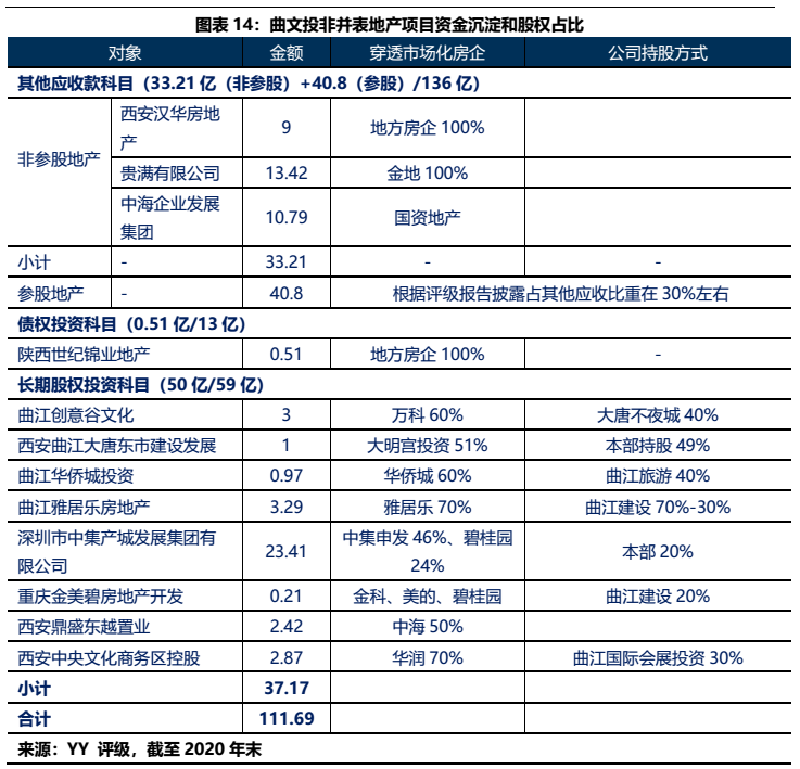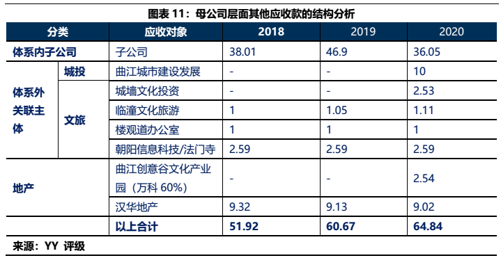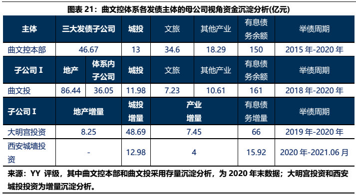 2)曲文投而言,屬于弱城投屬性主體,母公司層面資金沉淀于體系內子公司(36.05億)、地產相關(86.44)、城投相關(11.98億),文旅(7.23)和其他產業(10.61億)等;合并報表而言,涉房資產的體量下限值(332.69億)扣除預售后(130億)占合并報表有息債務(382億)的比重在53%左右。