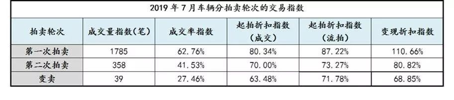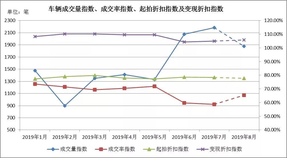 趨勢分析:7月車輛成交量為2182筆,小幅增長,增速較6月放緩,預測8月有回落趨勢;成交率為58.65%,較6月下降一個百分點;起拍折扣指數為78.34%,基本與上月持平;變現折扣指數為105.02%,小幅增長。