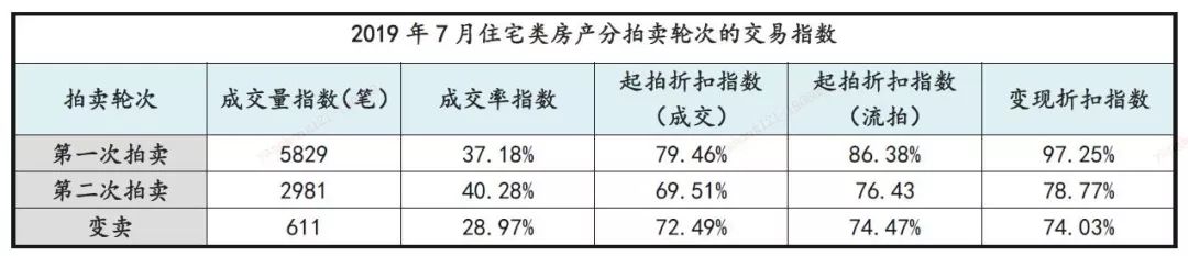 趨勢分析:7月住宅類房產拍賣市場成交量小幅降低,成交量9421筆,環比下降2.9%;成交率本期變化不大,為37.63%,較6月微升;起拍折扣指數為75.86%,較上月增長3%,變現折扣指數為89.89%,基本與6月持平。