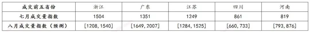 趨勢分析:7月在成交量上浙江省穩步增長,超越廣東省,排名第一;廣東省成交量出現大幅下降,環比下降17%;四川省與河南省的成交量都有所增加,四川省增幅較大,超越河南省,躍居第四,市場預期較好。從成交量走勢來看,浙江省與廣東省波動較為頻繁,特別是廣東省,每月的成交量變化較快。