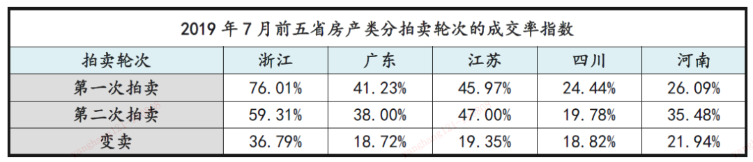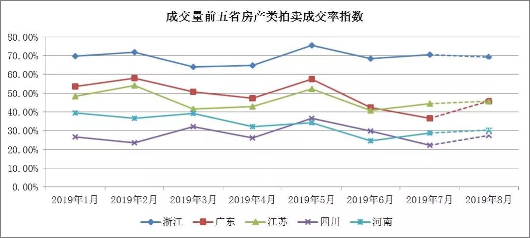 趨勢分析:7月的五省成交率變化有所差異,浙江省微升兩個百分點,江蘇省與河南省小幅增加4%,廣東省與四川省的成交率明顯下降。廣東省成交量與成交率雙降,說明市場處于低迷狀態,交易難度提升;四川省的成交量增加但成交率仍在下降,說明市場四川省的資產量多投資人相對較少,呈現明顯的買方市場。