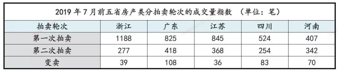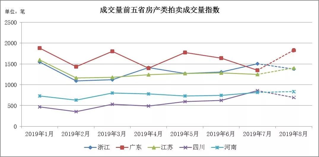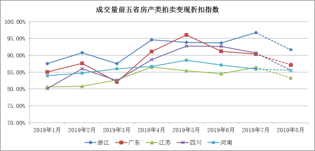 本部分展示2019年7月成交量排名前五省份的房產類成交量指數、成交率指數、起拍折扣指數與變現折扣指數。7月份成交量前五省為(從大到小):浙江、廣東、江蘇、四川、河南。相較于6月,浙江超越廣東排名第一,四川超越河南,躍居第四。