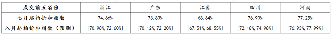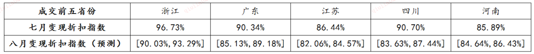 趨勢分析:7月浙江省、江蘇省變現折扣指數增幅較大,另三省呈下降趨勢。其中,浙江省的增幅最大,較6月增長3%,江蘇省在連續兩個月的下降后,7月變現折扣指數有所提升。整體來看,未來五省的變現折扣指數預期呈下降趨勢。