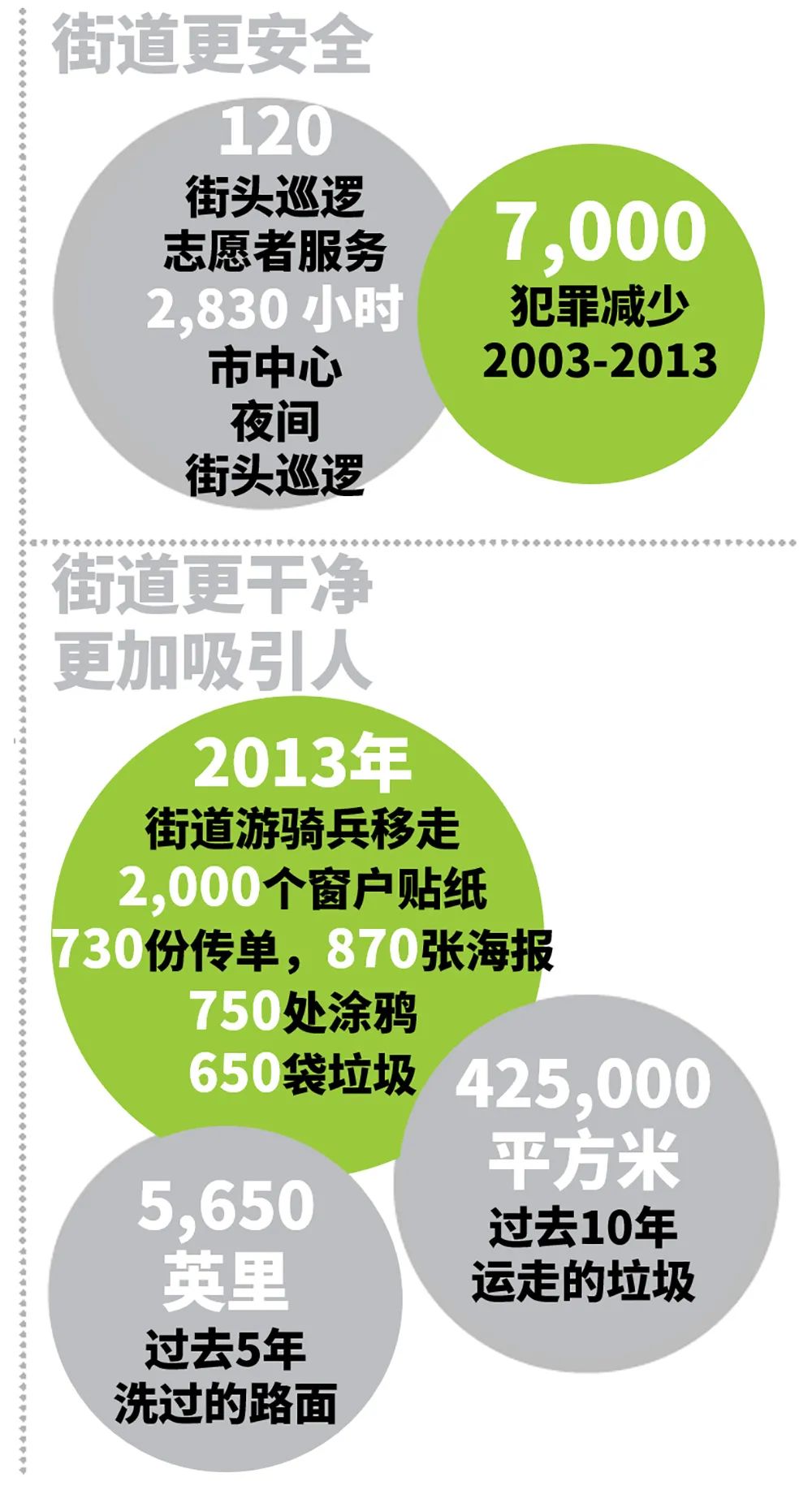 此外,商業促進區內以聯合巡邏隊形式,提升街區的治安環境;通過從政府到企業的宣傳推廣組合,提升民眾對街區環境的共同維護。