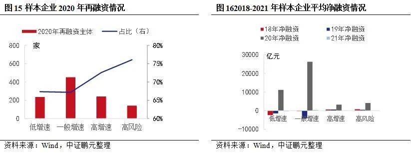 風險企業融資特征:通過對弱資企業2020年來的融資情況進行分析發現,第一,高風險企業債券接續需求高,再融資難度有所上升。第二,高杠桿率和現金短債比下降對融資成本的影響或逐步顯現。