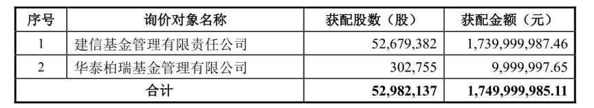隨后,萬豐奧威在2015年12月30日非公開發(fā)行股票發(fā)行情況公告中稱,公司共發(fā)行約5298萬股,發(fā)行價格為33.03元/股,共募集基金總額約17.5億元。此次非公開發(fā)行新增股份將于2015年12 月 31日在深圳證券交易所上市,且投資者認購的本次非公開發(fā)行股票自上市之日起 12 個月內(nèi)不得轉(zhuǎn)讓。而本次非公開發(fā)行的對象僅有2名,最終確定的發(fā)行對象及獲配情況如下: