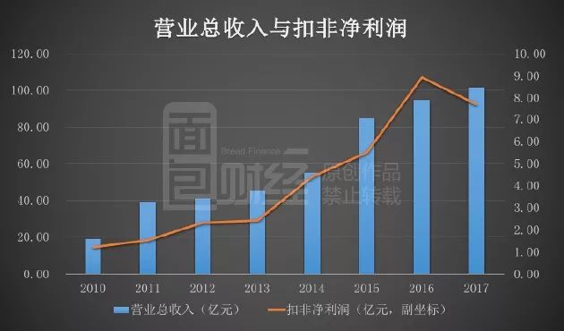 先交代一下萬豐奧威2017年的業(yè)績。公司的營業(yè)總收入突破了100億,同比增長7.29%,但歸母凈利潤與扣非凈利潤都出現(xiàn)了不同程度的下滑,較去年同期相比下滑分別為5.99%和13.6%,出現(xiàn)了增收不增利的情況。
