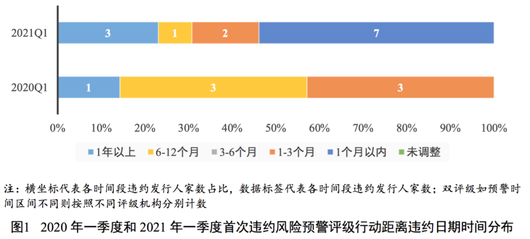 2021年一季度,我國債券市場13家新增違約發行人中有12家在違約前具有有效信用等級,違約事件發生前評級機構均通過各類評級行動進行了風險預警[7],首次違約風險預警評級行動日期距離違約日期時間在1個月以內的有7家,1~3個月(含)的有2家,6~12個月(含)的有1家,1年以上的有3家。整體來看,2021年一季度信用評級的預警及時性較2020年一季度有所下降,主要系海航集團流動性危機較早爆發且風險處置工作復雜,部分海航系發行人因技術性因素(無法提供跟蹤評級所需資料等)導致評級預警動作滯后。