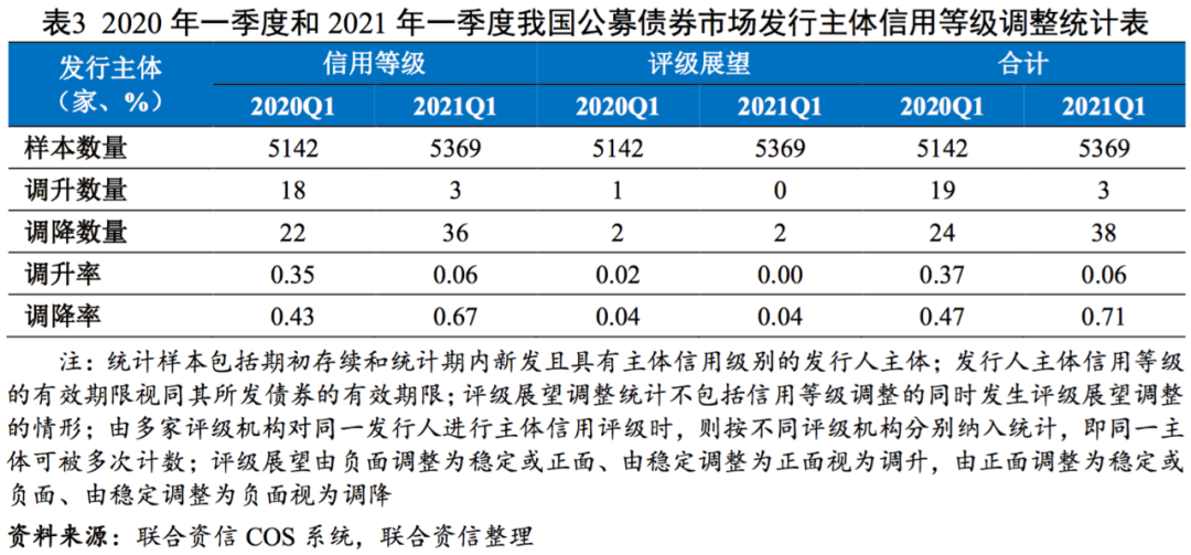 評級展望方面,2021年一季度我國公募債券市場無評級展望被調升的發行人,評級展望被調降的發行人有2家(均為由穩定調整為負面),評級展望調整數量較少,信用等級調整仍然是評級機構揭示發行主體信用風險的主要手段。