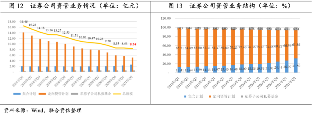 資產管理業務規模保持下降趨勢,集合計劃占比有所增加。“資管新規”過渡期進入“倒計時”,截至2021年6月末,證券公司資管業務總規模延續下降態勢,主要系定向資管計劃的壓降;集合計劃和私募基金管理規模穩步增長;證券公司資管業務仍以定向資管業務為主,但占比持續下降,集合計劃占比繼續提升,私募基金占比雖有所增長但占比仍較小,資產管理業務整體結構有所優化。