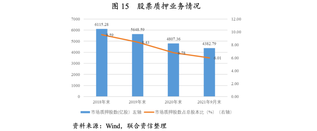質押股份市值以及質押股數占總股本比重持續下降,同時證券公司大規模計提減值準備,股票質押高比例質押風險進一步緩解。截至2021年9月末,股票質押市場質押股數占總股本比6.01%,較二季度末下降0.36個百分點;市場質押股份市值合計41846.22億元,較二季度末下降2.48%。控股股東(按第一大股東口徑統計,下同)持股質押比例超過80%的上市公司家數293家,較二季度末減少15家,高比例質押風險進一步緩解。