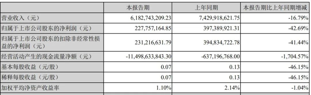 和2021年數據正相反,2022年1季度濱江集團的營收和凈利潤同比均呈下跌狀態。如下圖,營收同比下降16.79%,為61.83億元;歸屬于上市公司股東的凈利潤同比下降42.69%,為2.28億元。經營活動產生的現金流量凈額同比大跌1704.57%,為-115.0億元。