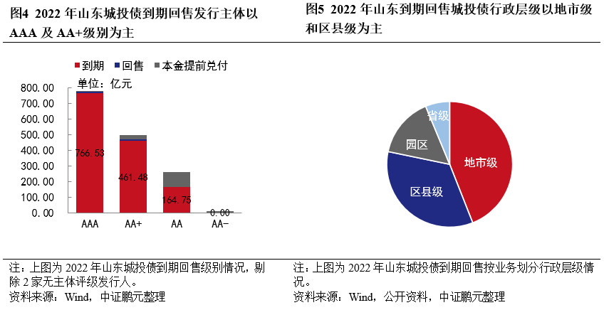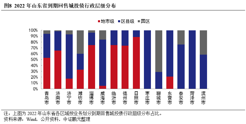 行政層級方面,地市級和區(qū)縣級平臺為2022年山東城投主要償債主體,省級、地市級、區(qū)縣級和園區(qū)平臺到期回售城投債規(guī)模分別為92.63億元、650.12億元、510.22億元和220.84億元。