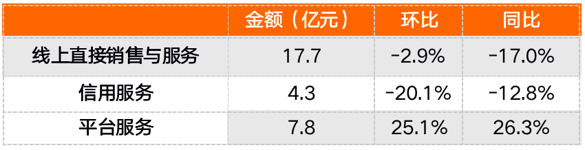 根據(jù)財(cái)報(bào),三季度樂(lè)信的電商業(yè)務(wù)GMV為12.8億元,同比下降3.3%,而二季度的GMV為15億元,所以三季度環(huán)比下降了14.7%;線上直接銷售與服務(wù)收入17.7億元,同比減少17%,環(huán)比減少2.9%。