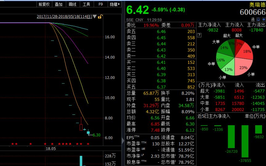 停牌一年的奧瑞德(600666.SH)于2018年5月4日復(fù)牌,復(fù)牌后,遭遇連續(xù)8個一字跌停,市值蒸發(fā)超過120多億。
