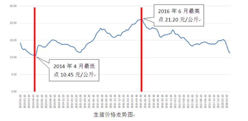 行業(yè)普遍的看法:本輪周期起點(diǎn)是2014年4月的10.45元/公斤,最高點(diǎn)為2016年6月的21.20元/公斤,之后價格震蕩下行,2018年3月份,價格最低下降至11.3元/公斤。