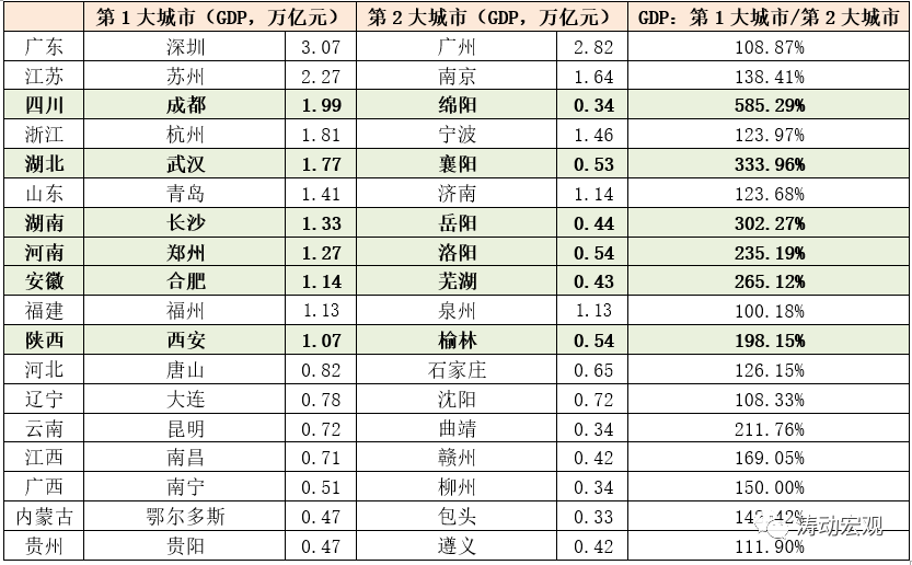 具體看,成都的經濟總量達到1.99萬億,是四川第2大城市綿陽的5.85倍;武漢的經濟總量達到1.77萬億,是湖北第2大城市襄陽的3.34倍;長沙的經濟總量達到1.33萬億,是湖南第2大城市岳陽的3.02倍;合肥的經濟總量達到1.14萬億,是安徽第2大城市蕪湖的2.65倍;鄭州的經濟總量達到1.27萬億,是河南第2大城市洛陽的2.35倍;西安的經濟總量達到1.07萬億,是陜西第2大城市榆林的1.98倍等等。
