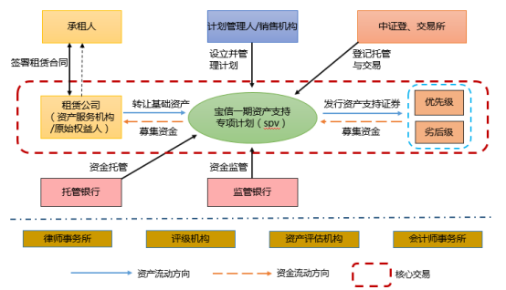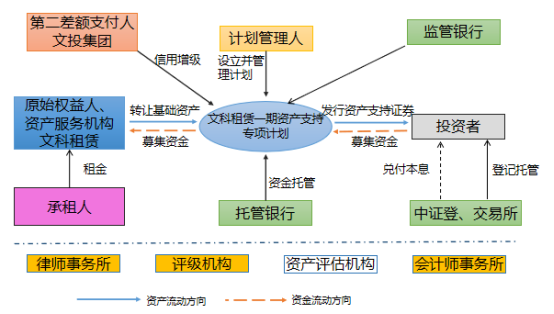 已發行的第一創業-文科租賃一期資產支持專項計劃是典型的融資租賃債權ABS產品的交易結構。融資租賃公司打包轉讓融資租賃資產的融資標的物即無形資產知識產權,再由融資租賃公司回租給承租人,形成穩定的、特定的現金流。