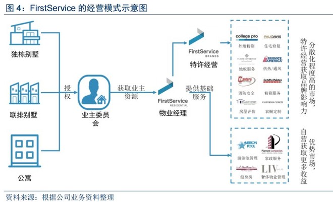 FirstService是北美地區物業服務的領先者,通過兩大服務平臺為客戶提供綜合物業服務:一個是住宅平臺FirstService Residential,是北美最大的住宅物業管理平臺;另一個是品牌平臺FirstService Brands,是北美最大的基本物業服務供應商之一。根據中信證券研報,其提供的服務主要如下: