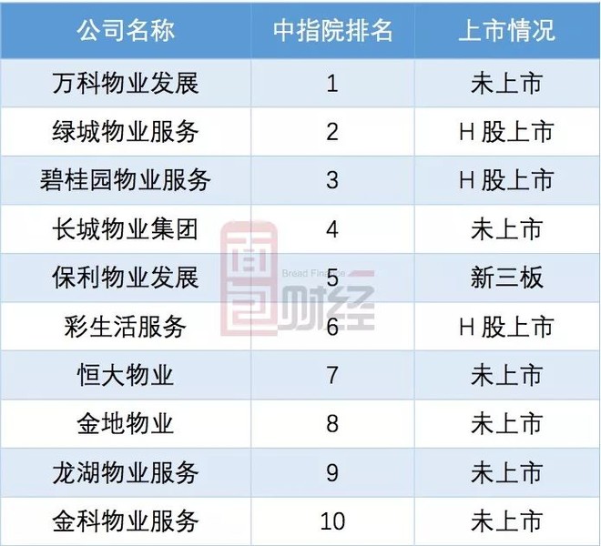 而在中國指數研究院(簡稱中指院)最新的中國百強物業管理公司排名中,大多物業管理公司都有著地產開發背景。下表為面包財經整理的中指院2017年中國物業百強名單中的TOP10: