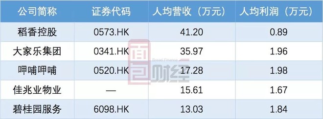 佳兆業的人均營收水平也與碧桂園在一個檔次上,人均利潤則更低。根據聆訊資料集披露的數據,截止2017年底佳兆業物業員工總數4285人,人均營收和利潤分別為15.61萬元和1.67萬元。