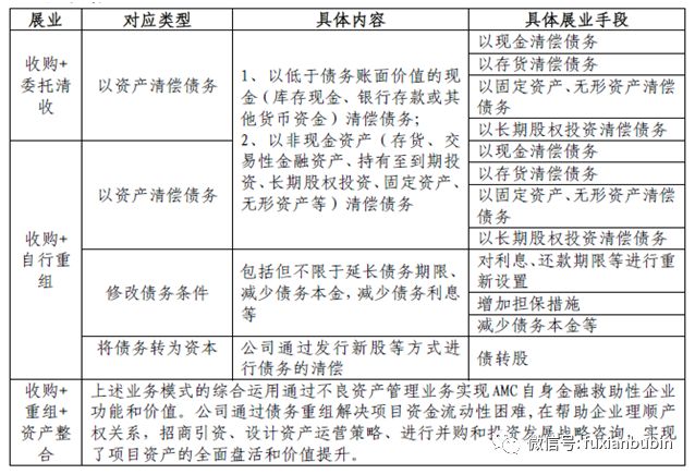 根據《企業會計準則第12號——債務重組》(第三條)相關規定,債務重組主要包括“以資產清償債務、將債務轉為資本,修改其他債務條件(包括但不限于延長債務償還期限、延長債務償還期限并加收利息、延長債務償還期限并減少債務本金或債務利息),或以上手段的綜合使用”。其與不良資產經營市場主體的債務重組業務可做如下對應: