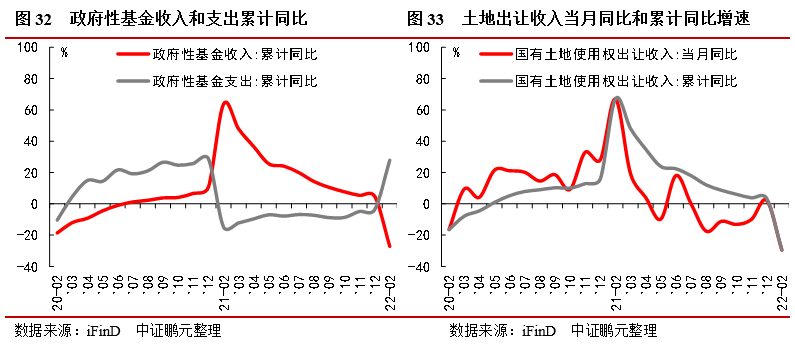 全國公共財政支出回升,靠前發力,基建支出加快。1-2月累計,全國一般公共預算支出38,227億元,同比增長7.0%,較2021年全年同比0.3%明顯上升,大幅高于2021年12月當月同比-14.2%。前2月的財政支出占全年預算支出的比重達到14.3%,創同期新高,體現了積極的財政政策,發力靠前。分結構來看,10個支出分項中累計同比增速由高至低:科學技術(15.5%)、交通運輸(14.0%)、節能環保(11.9%)、教育(9.1%)、城鄉社區事務(7.6%)、文化旅游體育與傳媒(5.7%)、社會保障和就業(7.8%)、農林水事務(3.5%)、衛生健康(4.0%)、債務付息(-12.9%)?;ㄖС觯ń煌ㄟ\輸、城鄉社區事務、農林水事務)表現較快增長,1-2月增長8.0%,大幅高于去年12月單月同比-16.4%、也高于去年12月兩年平均增速-4.8%。民生性支出(衛生健康、社會保障和就業、教育)也表現較好,科學技術支出增速最快。